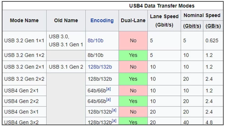 | Minimum data transfer speed | 20 Gbps (some devices) | 40 Gbps (all devices) |