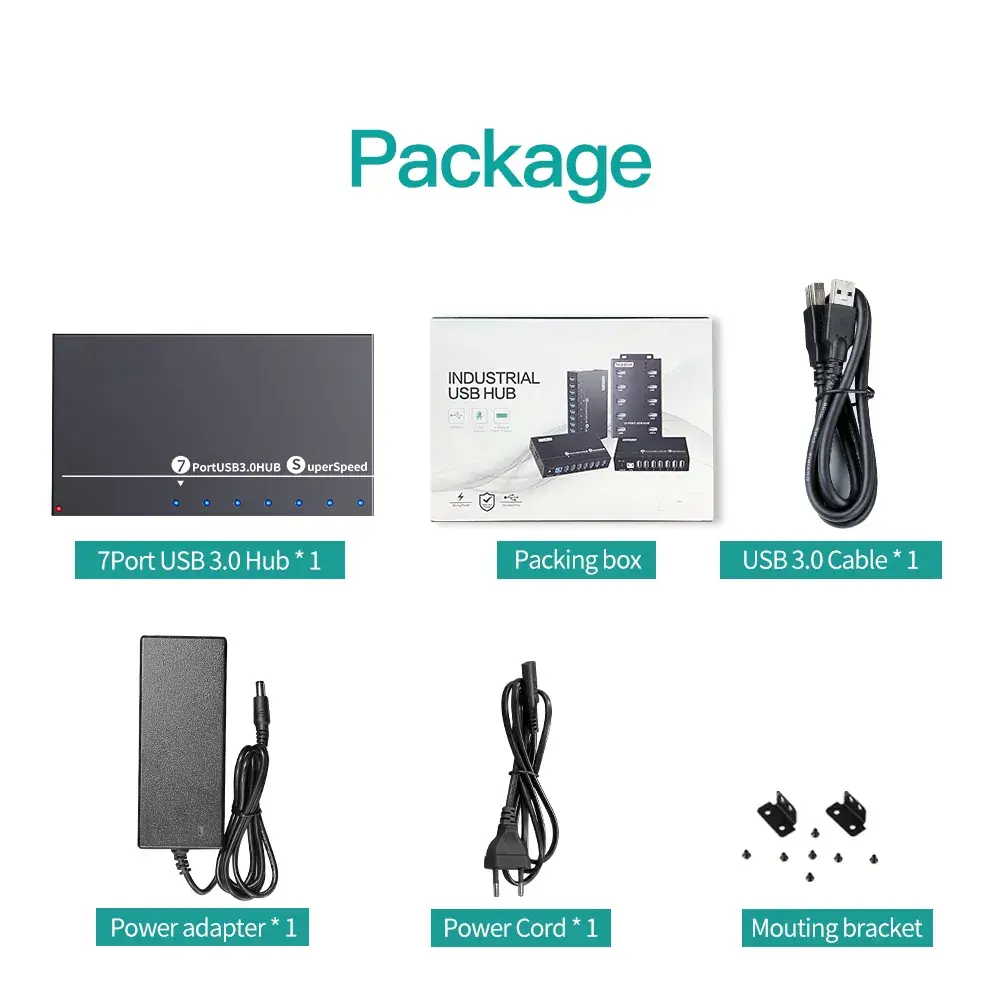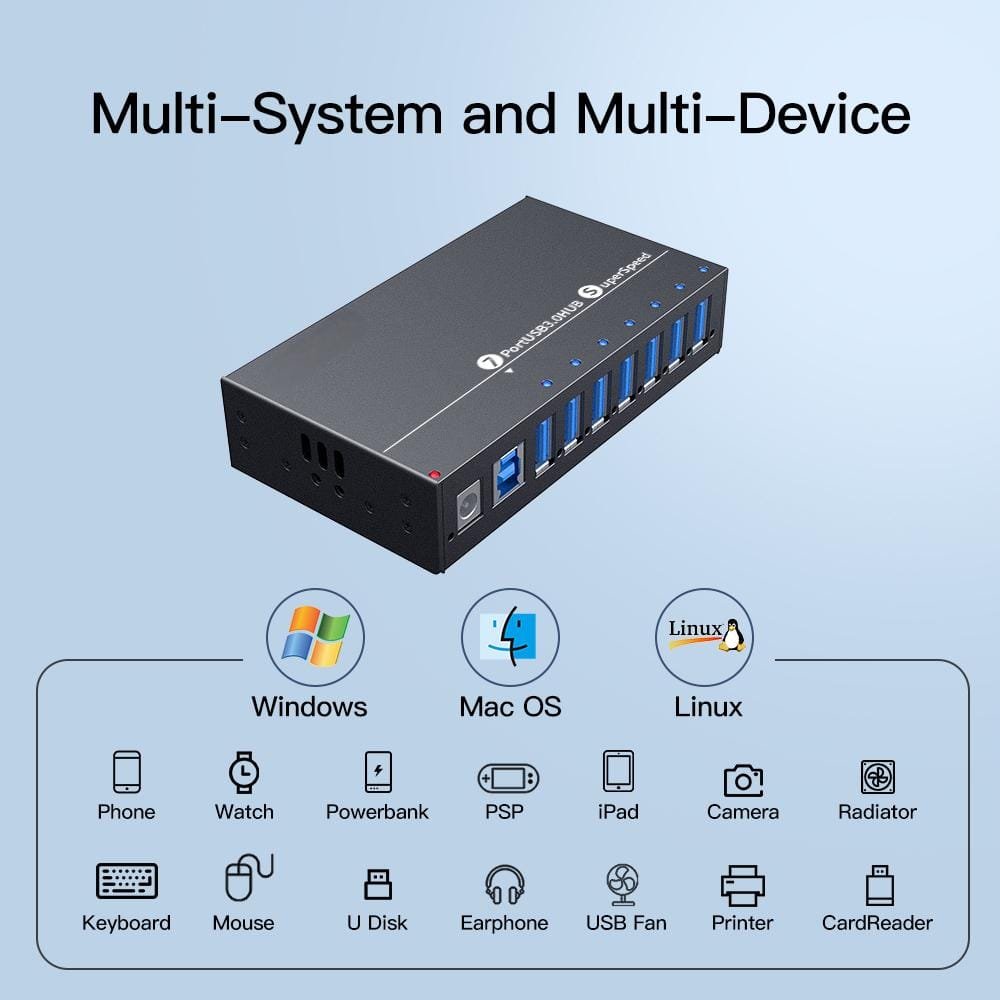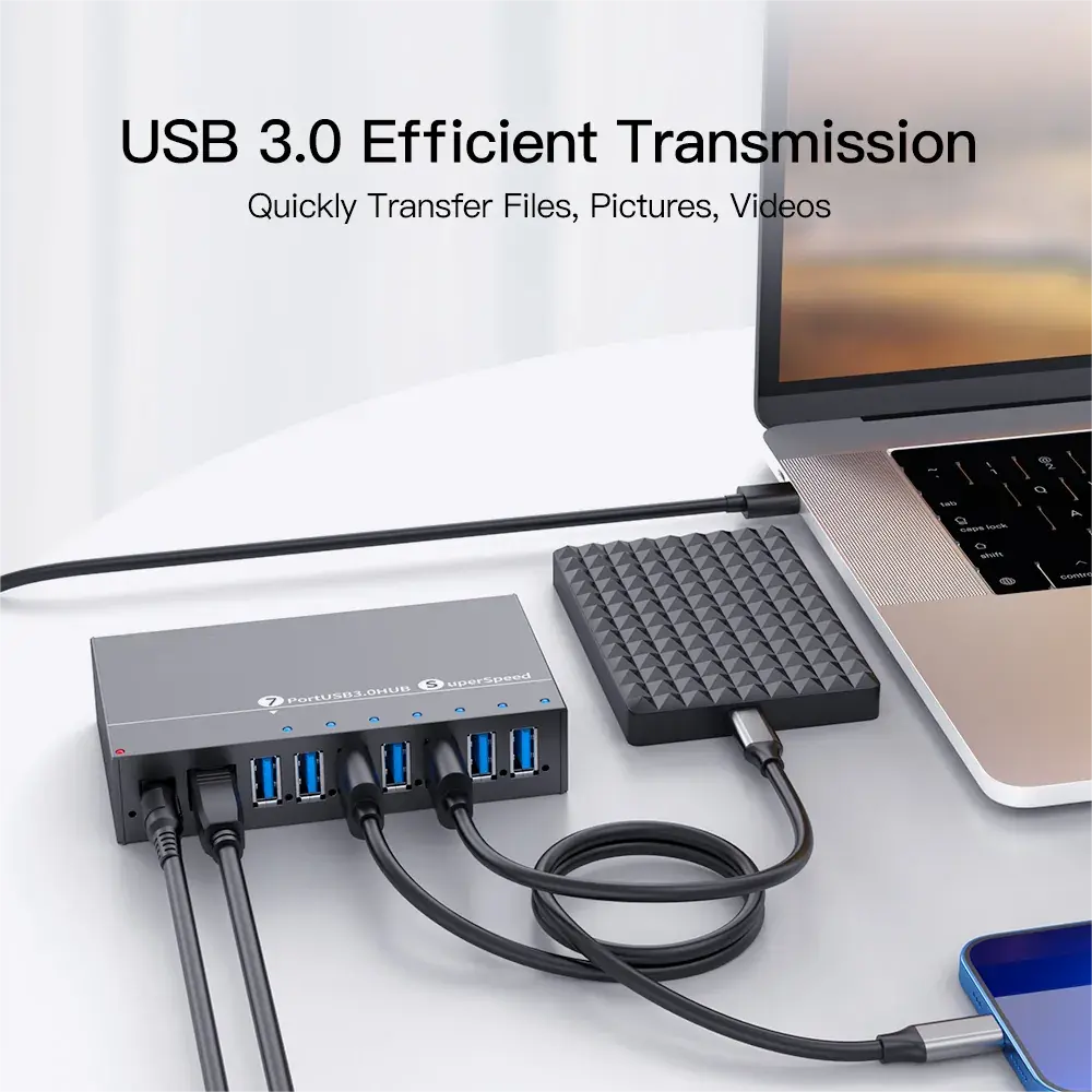 The FBWT-U307 is a high-performance 7-Port USB 3.0 Hub, designed to simplify and enhance connectivity for multiple USB devices. With 7 USB 3.0 ports, it expands a single USB port into ten, allowing for seamless connection of peripherals such as keyboards, mice, printers, scanners, and more.